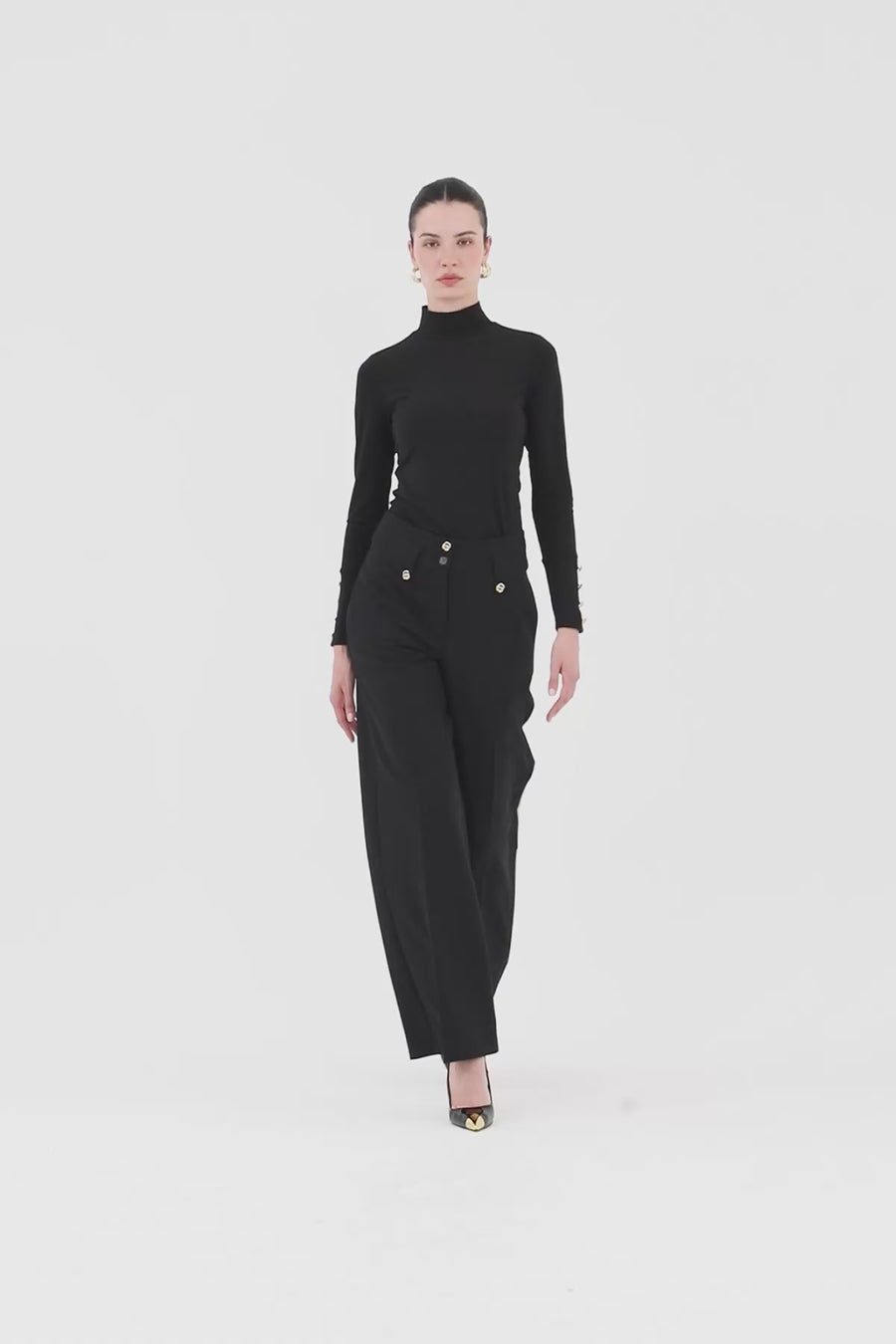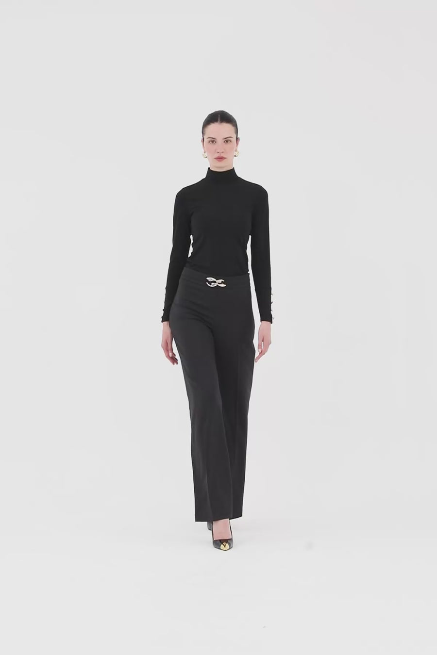 Ütü İzli Düğme Detaylı Siayh Palazzo Pantolon