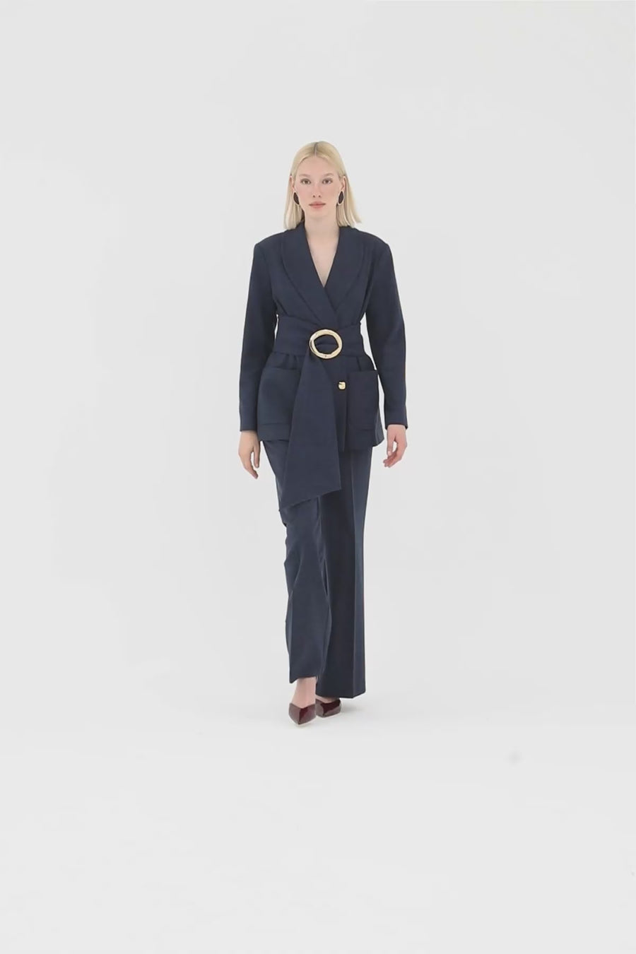 Kruvaze Kapamalı Kemerli Ceket Ve Palazzo Pantolon