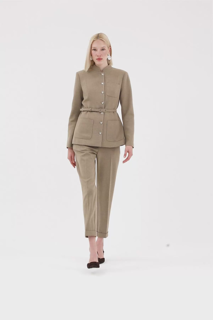 Kruvaze Kapamalı Kemerli Ceket Ve Pantolonlu Takım