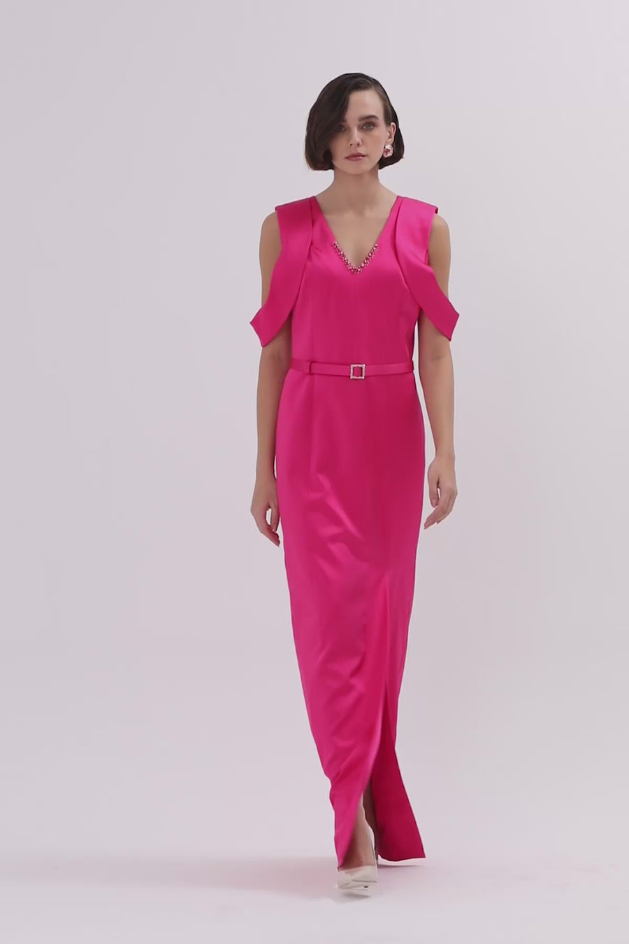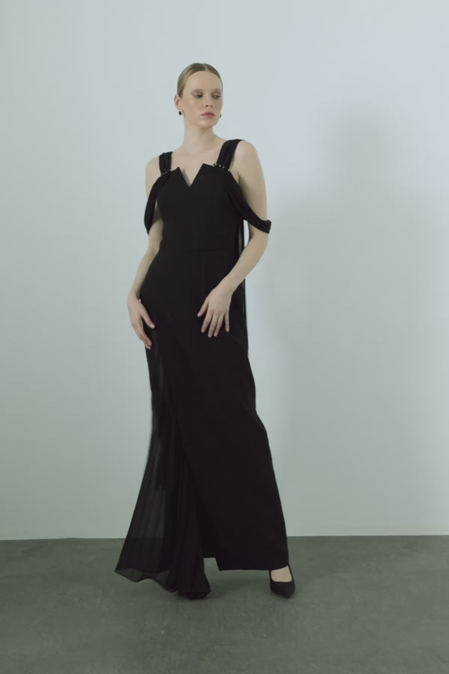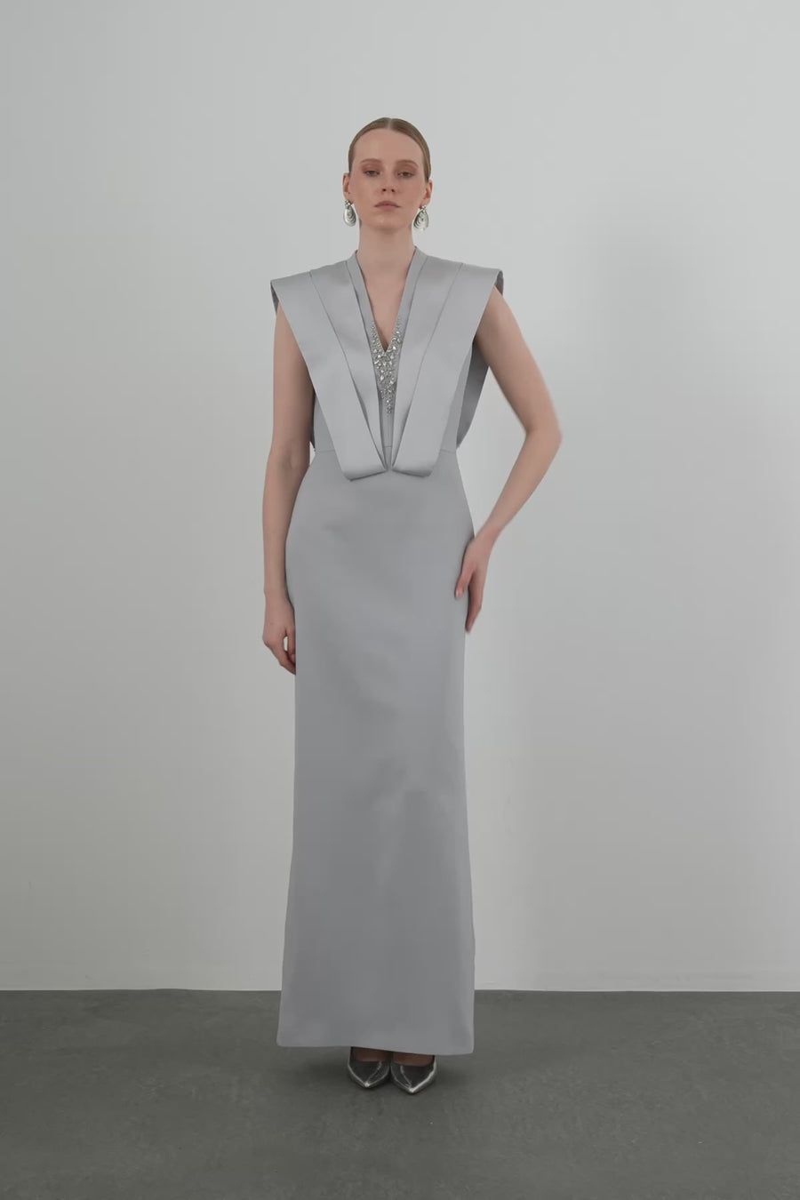 V Yaka İşleme Detaylı Yırtmaçlı Uzun Abiye Elbise