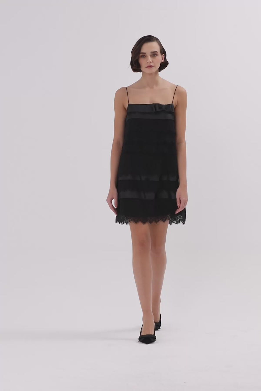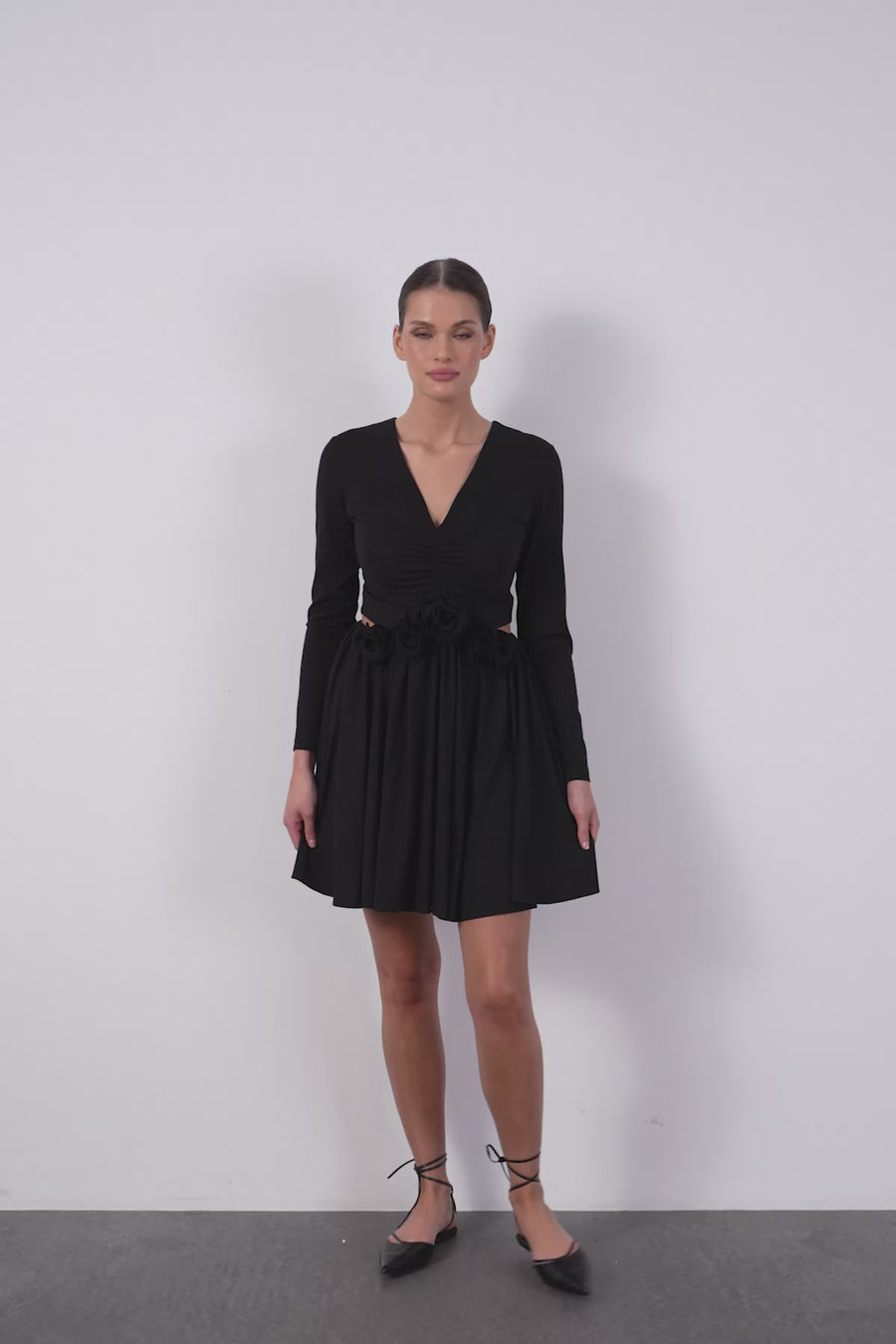 Asimetrik Yaka İşlemeli Tül Detaylı Kısa Elbise