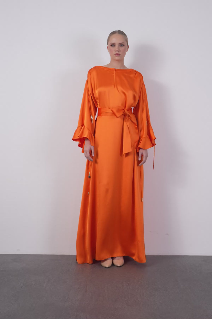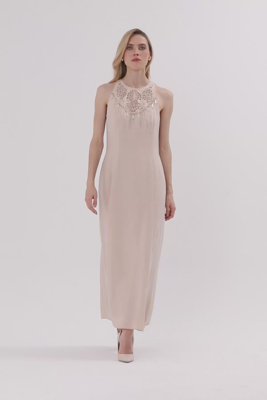 Dantel Detaylı Belden Pileli Uzun Kollu Uzun Elbise
