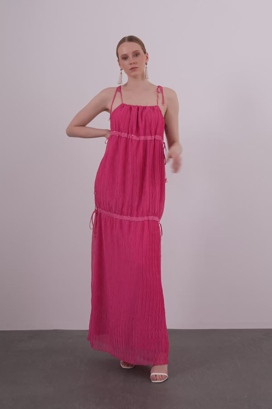 Askıları İşlemeli Eteği Pilikaşeli Elbise