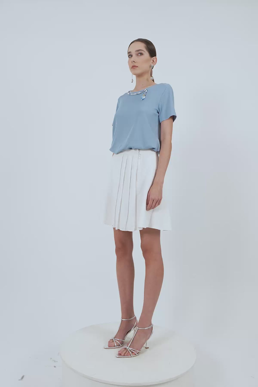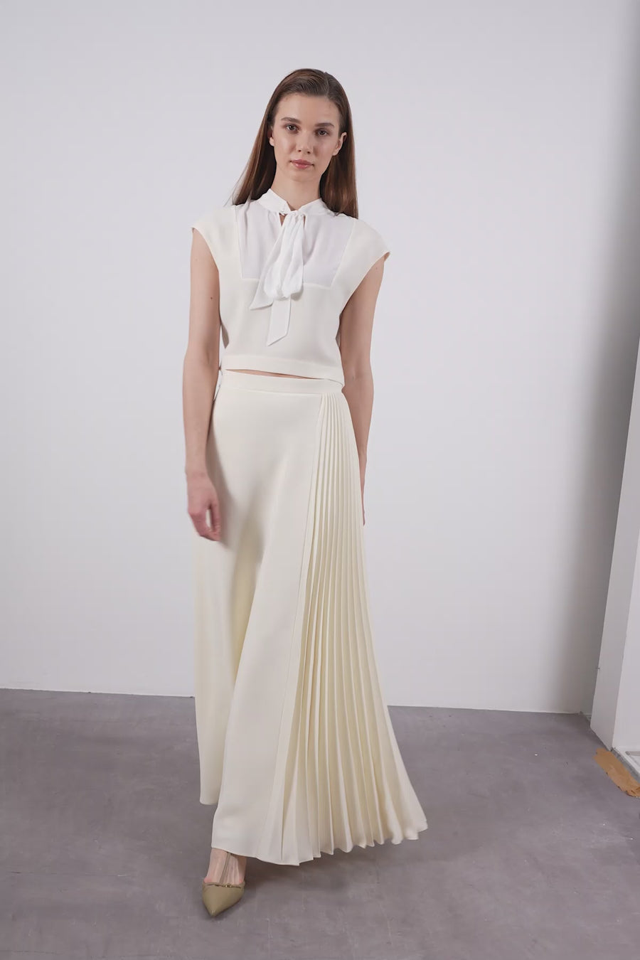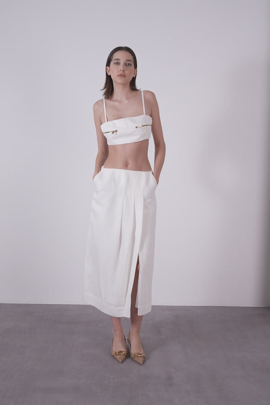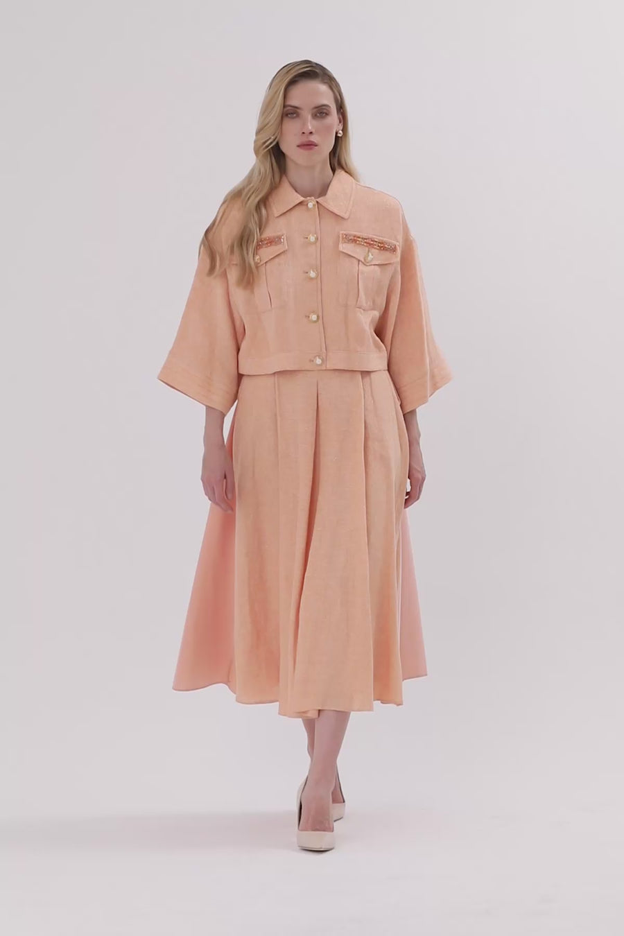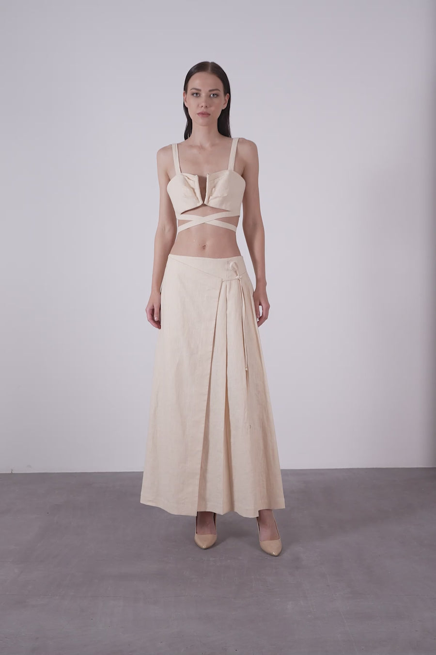 Ön Beden Pileli Ve Yırtmaç Detaylı Keten Etek
