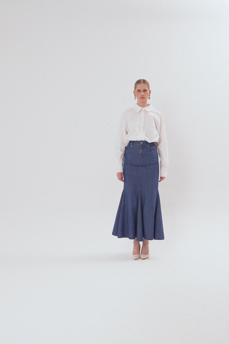 Yüksek Bel Ön Yırtmaçlı Denim Etek