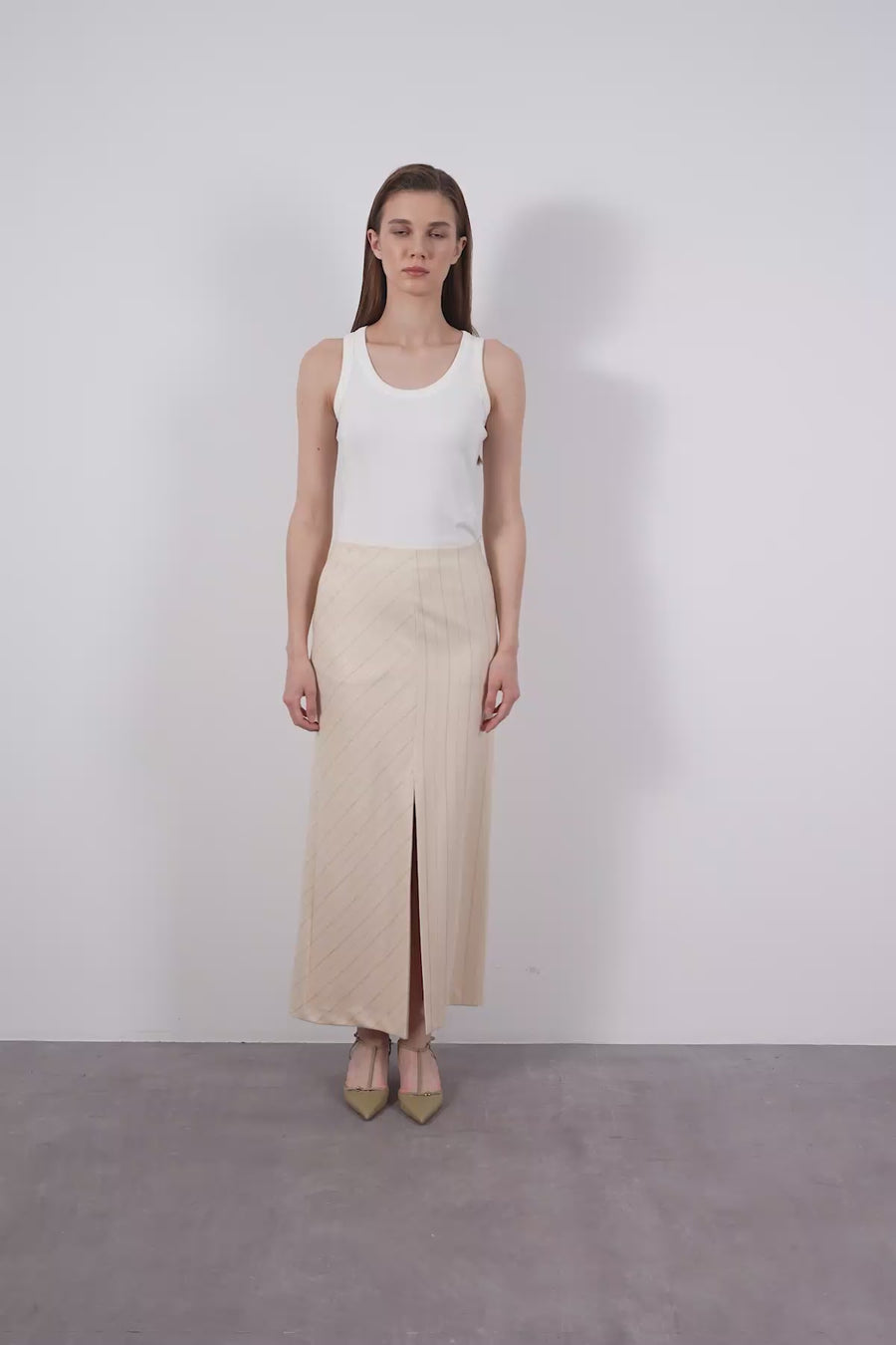 Çizgi Desenli Yırtmaçlı Uzun Etek