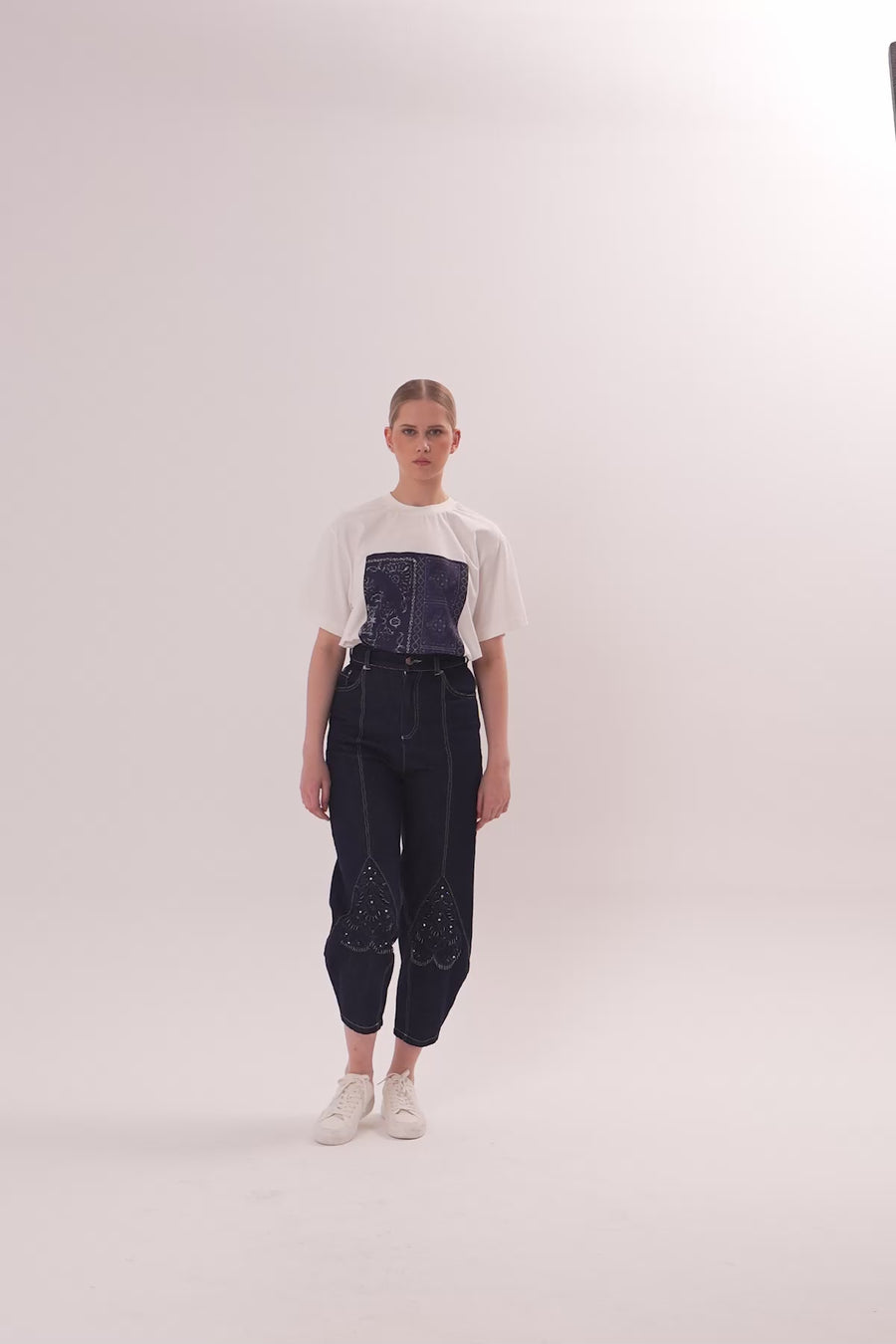 Nakış Boncuk İşlemeli Bol Kesim Paçada Daralan Jean Pantolon