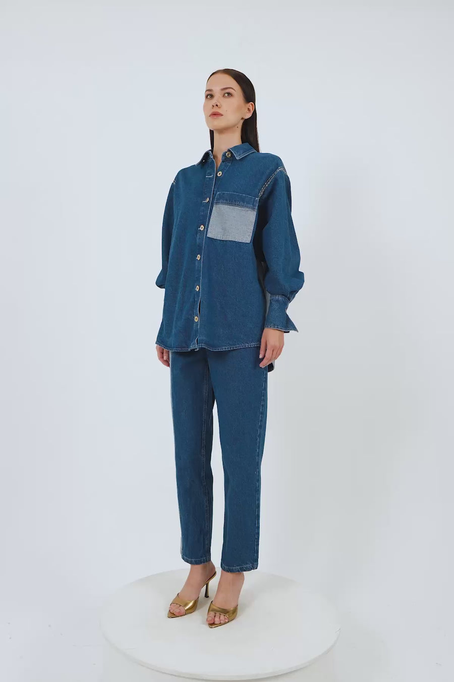 Arkadan Deri Baskı Cepli Önden Dikiş Detaylı Jean Pantolon