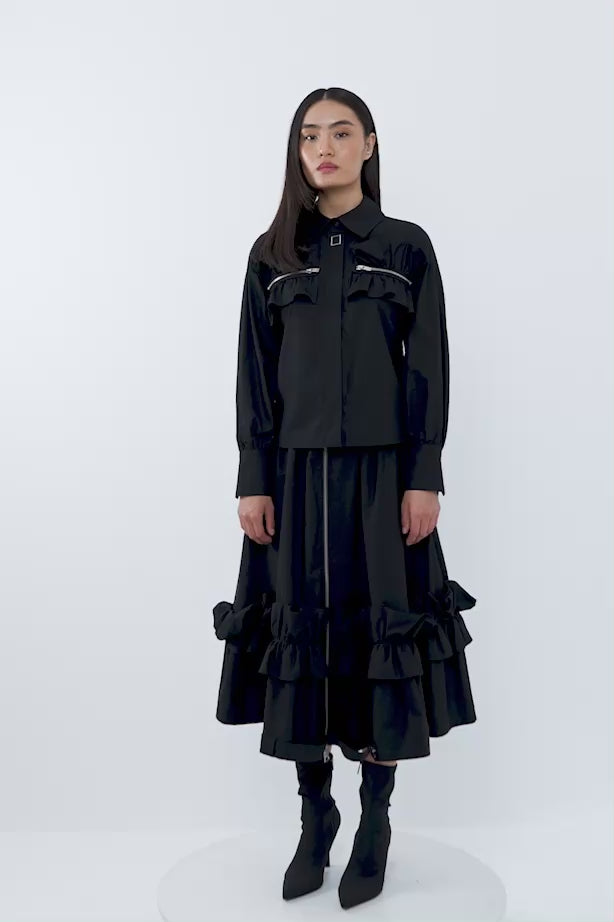 Fırfırlı Ve Büzgülü Kollu İnci Düğmeli Gömlek