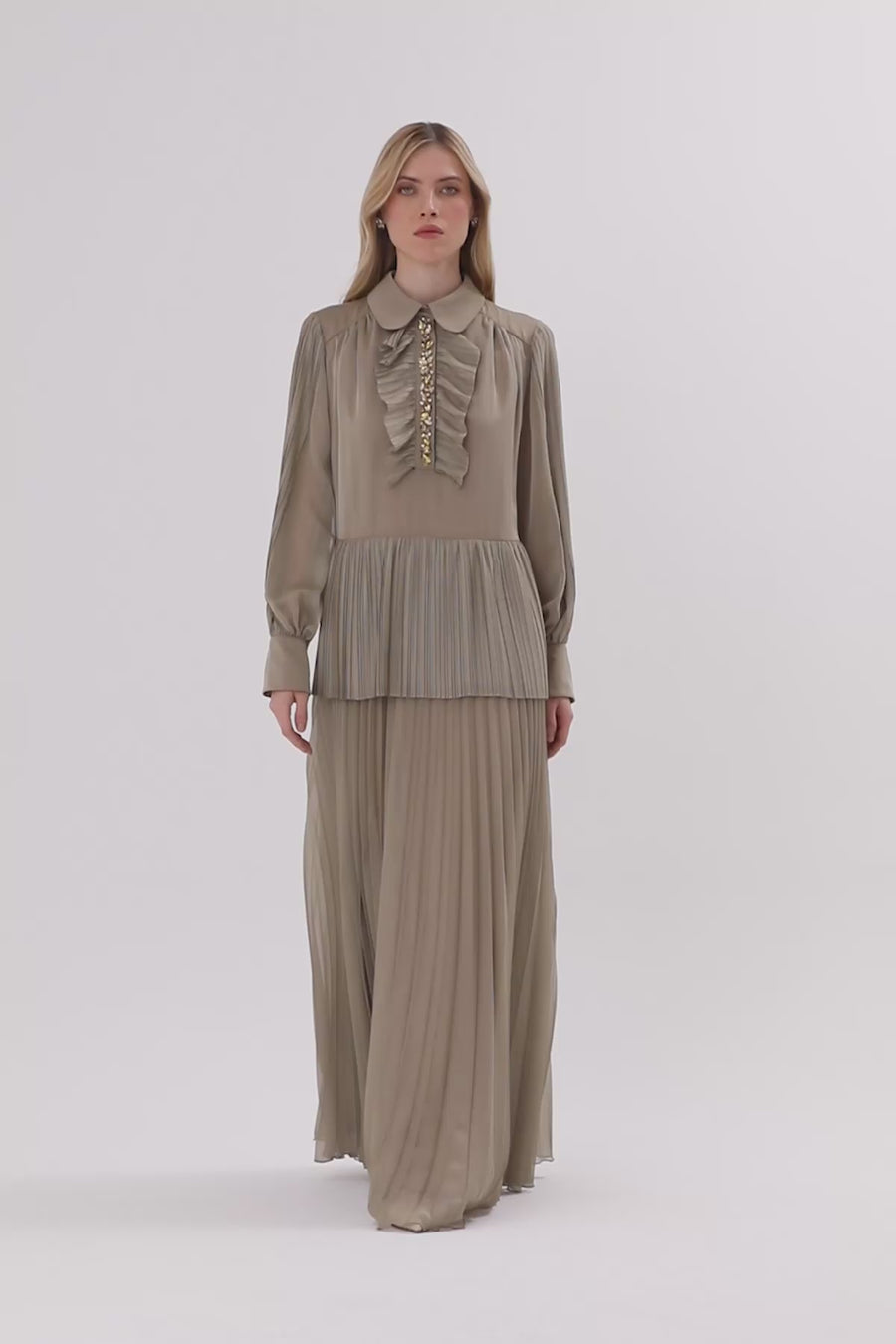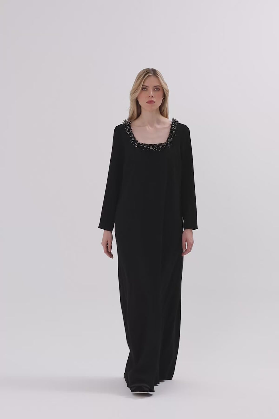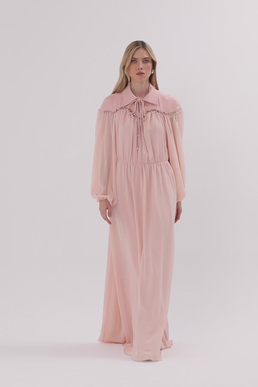 Piliseli Boncuk İşlemeli Uzun Elbise