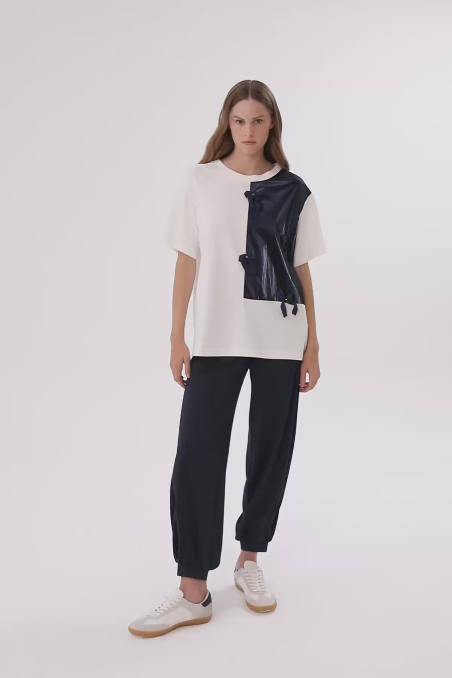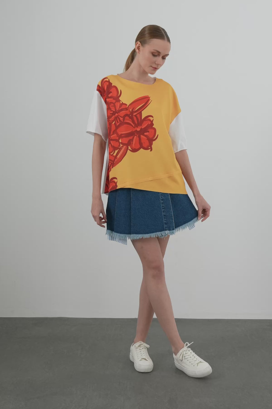 Önü Pano Desenli Garnili Yarım Kollu Klasik Tshirt