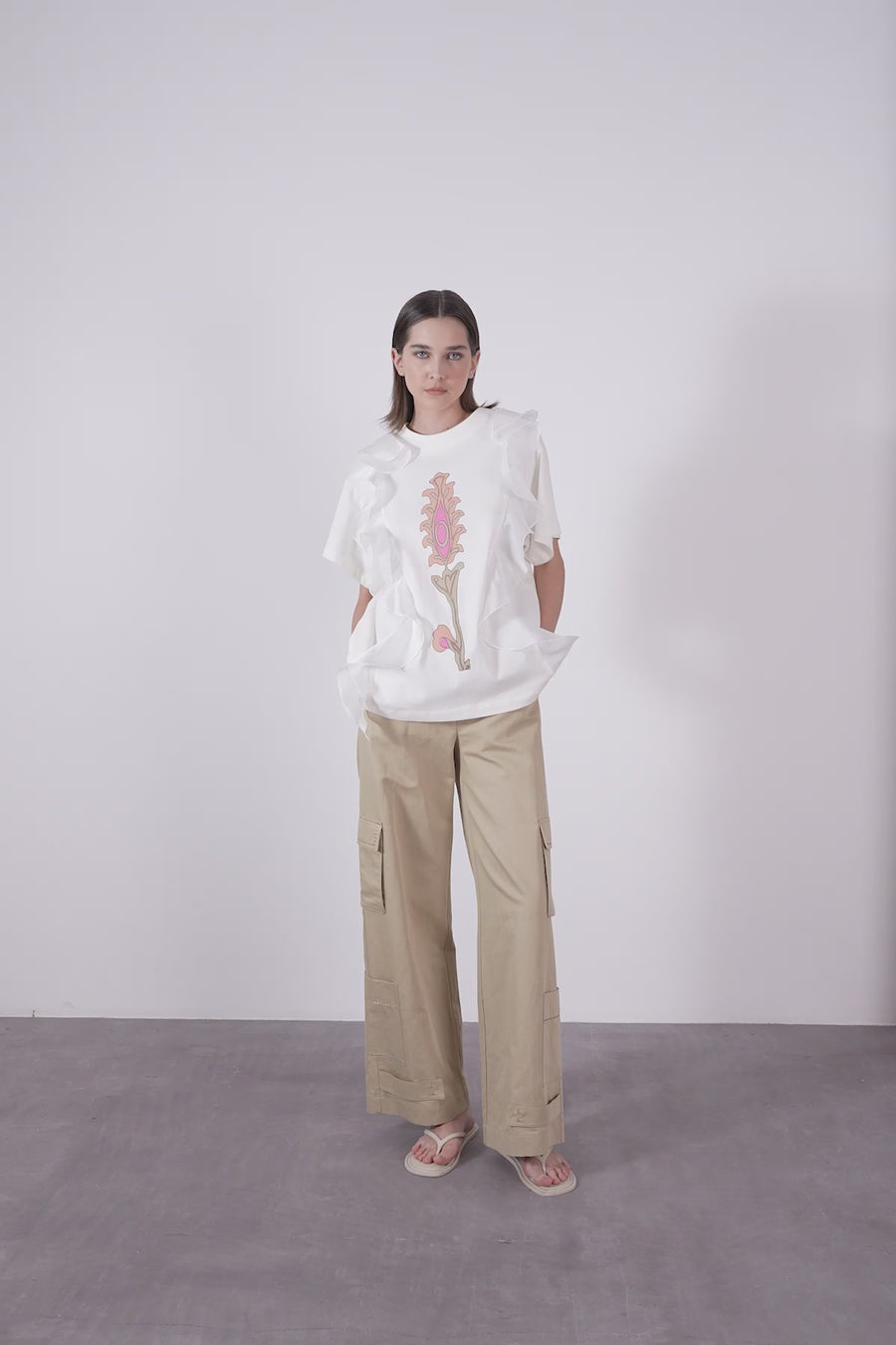 Yuvarlak Yaka Organze Volanlı Kısa Kollu T-shırt