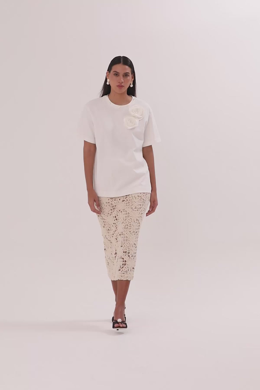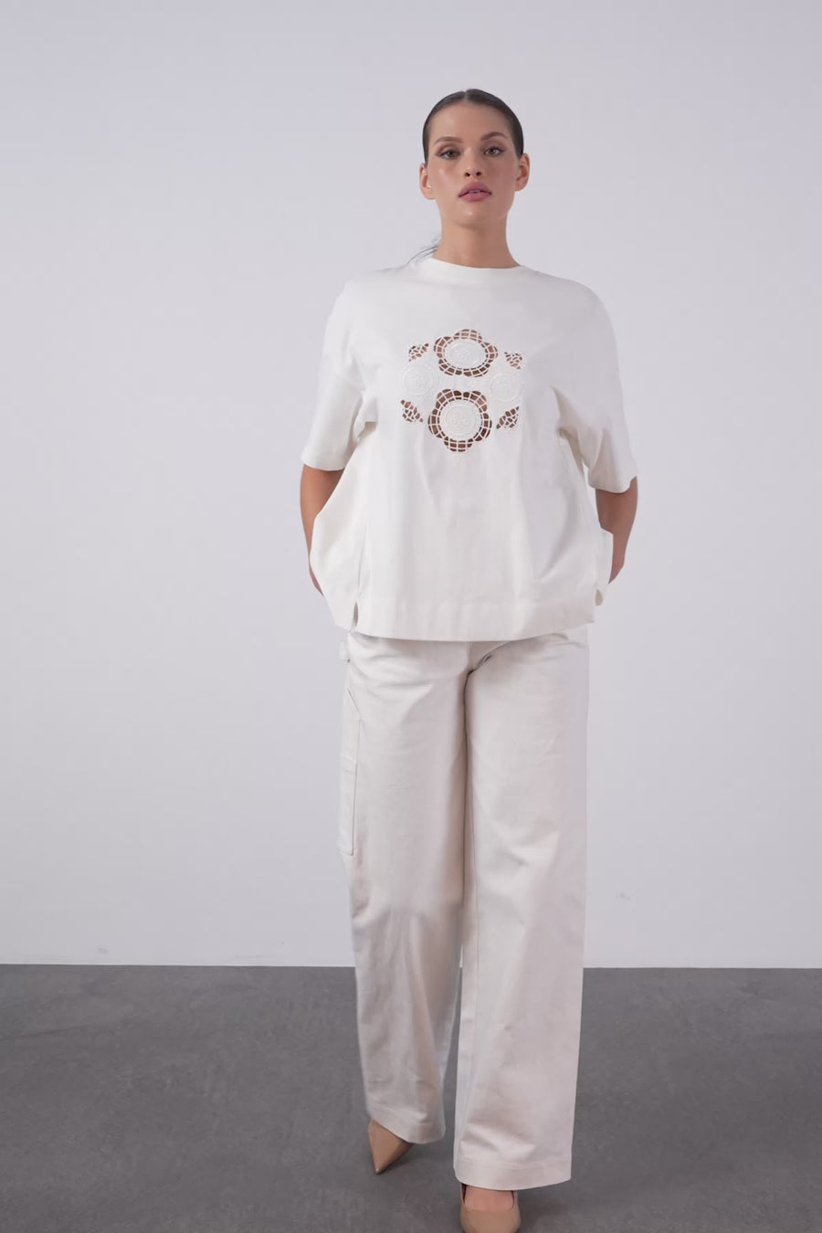 Kurdele İşlemeli Yuvarlak Yaka Kısa Kollu Tshirt