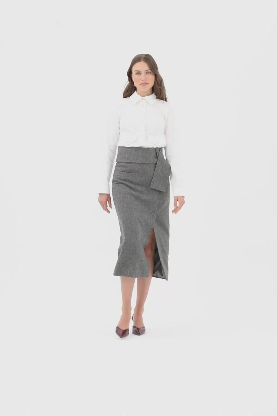 Önden Kapalı Yırtmaçlı Cepli Kemer Detaylı Etek