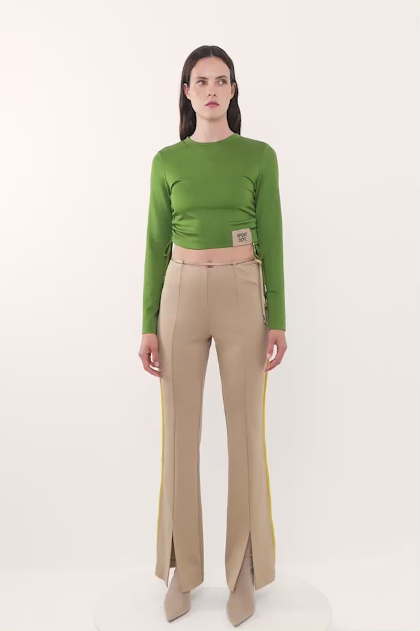 Beli Bağlama Detaylı Ön Paça Yırtmaçlı Flare Pantolon