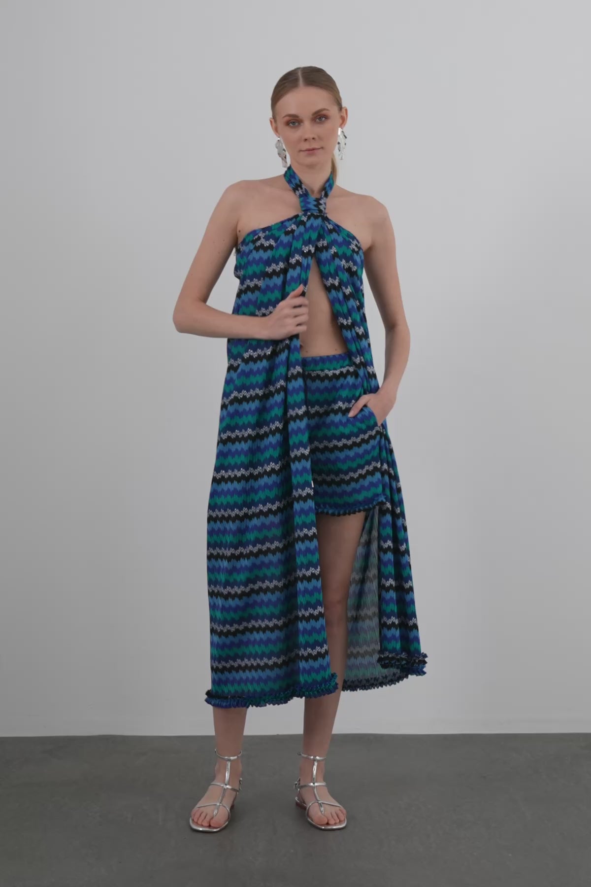 Boyundan Bağlamalı Renkli Midi Elbise