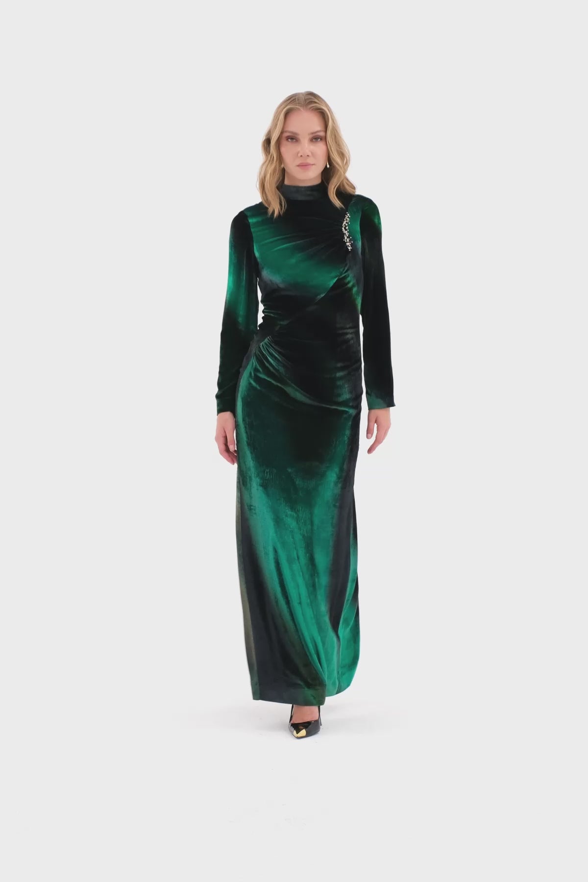 Dik Yaka Önden Büzgü Ve Boncuk İşlemeli Elbise