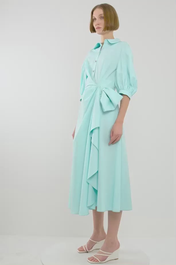 Kolları Büzgülü Yarım Fiyonk Detaylı Düğmeli Midi Yeşili Elbise
