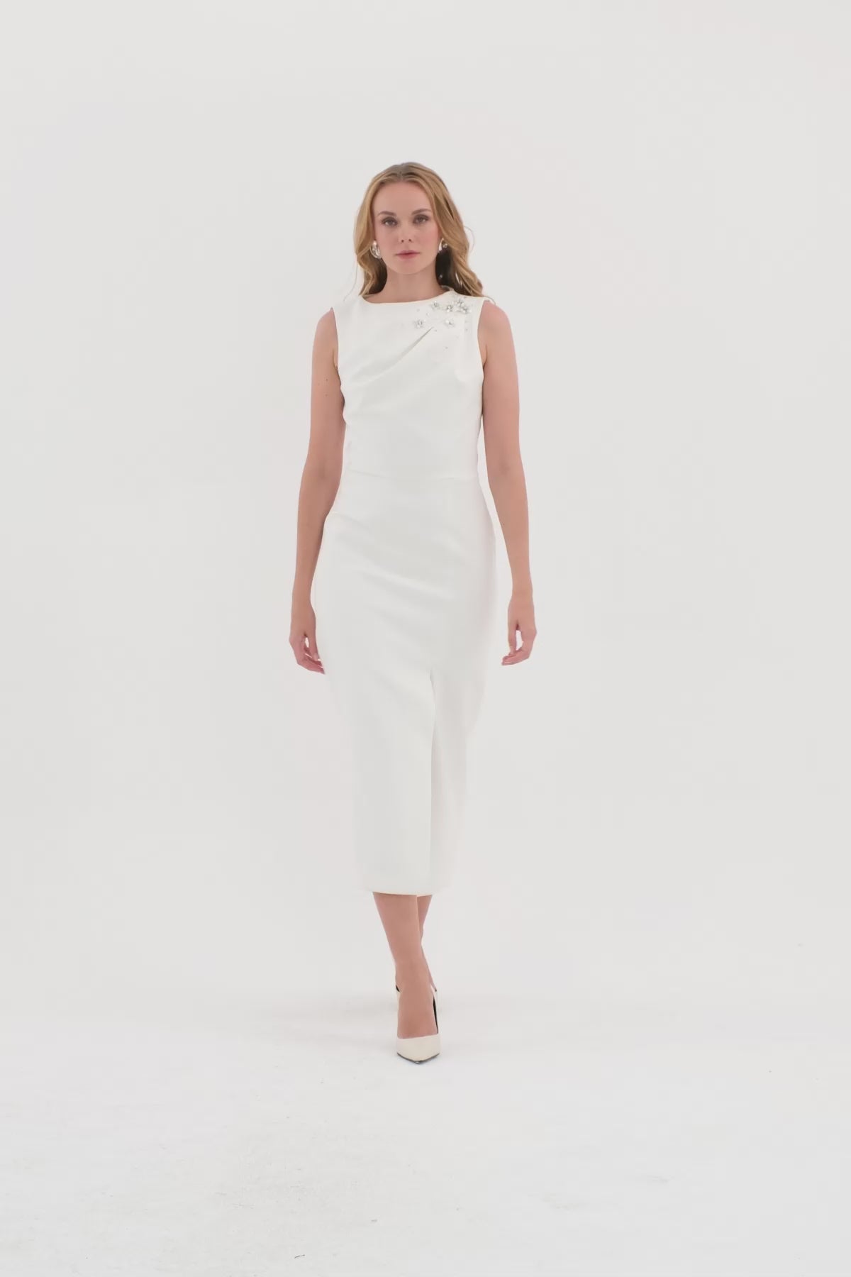 Omuzda Drepe Detaylı Yırtmaçlı Elbise
