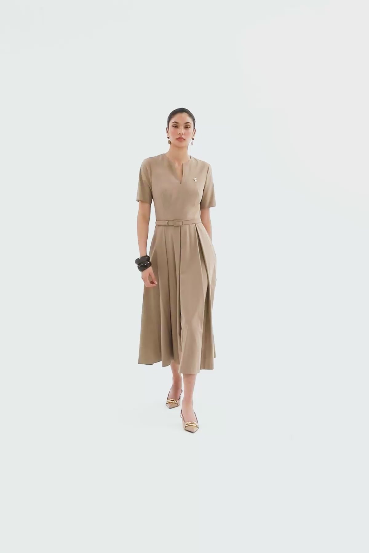 V Yaka Eteği Pileli Uzun Elbise