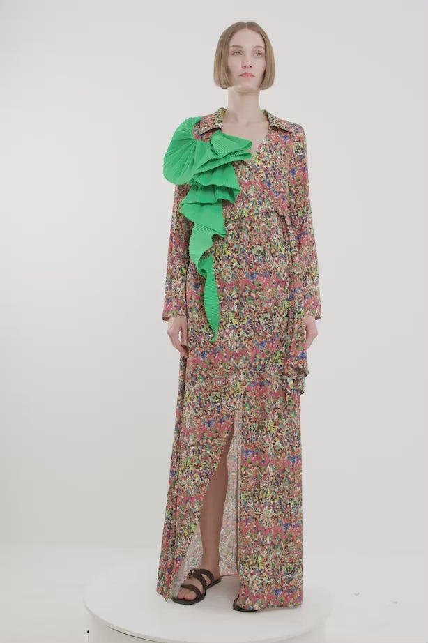 V Yaka Omuzda Pilise Detaylı Uzun Çok Renkli Elbise